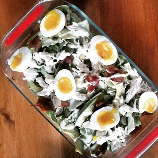 Bring a medium size pot of water and a shake of salt to a boil and add your eggs and chicken. The eggs will take 7 minutes to come to a medium hard boil. (So when you slice them open later, they will have a semi runnyness to them). Once you’ve used a slotted spoon to remove your eggs from the boiling water, run cold water over them or submerge them into a bowl of cold water. The chicken will take roughly 10 minutes still to cook through completely and then you can drain the chicken and place aside on a plate. In a nonstick pan, over medium high heat, fry your bacon to a brown crisp. Chop your head of lettuce into bite sized portions and place in a shallow casserole dish. In a bowl, whisk together mayo, dijon mustard, vinegar and pepper. Remove your cooked bacon from the pan and place on paper towel to allow the oil to get sopped up. Now back to the chicken drying on the plate. Using a fork, shred the chicken and scatter over your lettuce. Add the bacon to the concoction and then de-shell your eggs and slice lengthwise in half before placing them on your lettuce bed. Drizzle your mayo, mustard sauce over the salad dish and dig in!